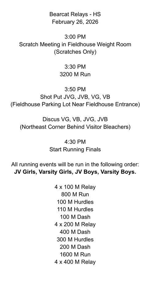 HS TRACK MEET AT DELEON 2/26/26 High School will be at the Deleon Track Meet Thursday, Feb. 26th. Please see photo for event times. Print